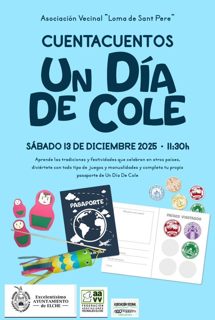 Este sábado 13 de diciembre, a las 11:30h, la AV Loma Sant Pere acogerá un evento especial de cuentacuentos dirigido al público infantil. Durante la actividad, los niños descubrirán las festividades de varios países a través de relatos, juegos y manualidades. También elaborarán su propio pasaporte de “Un Día de Cole”.